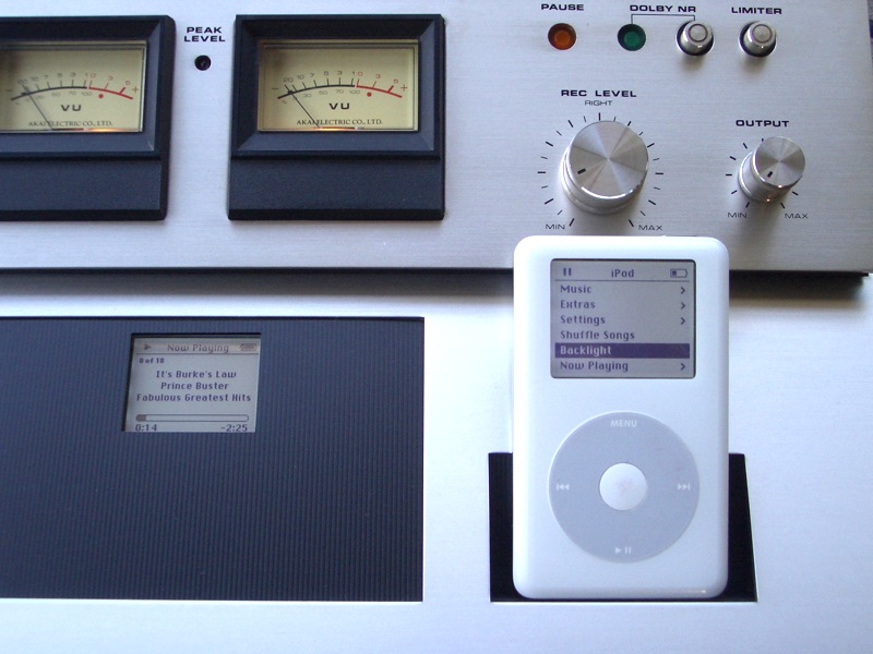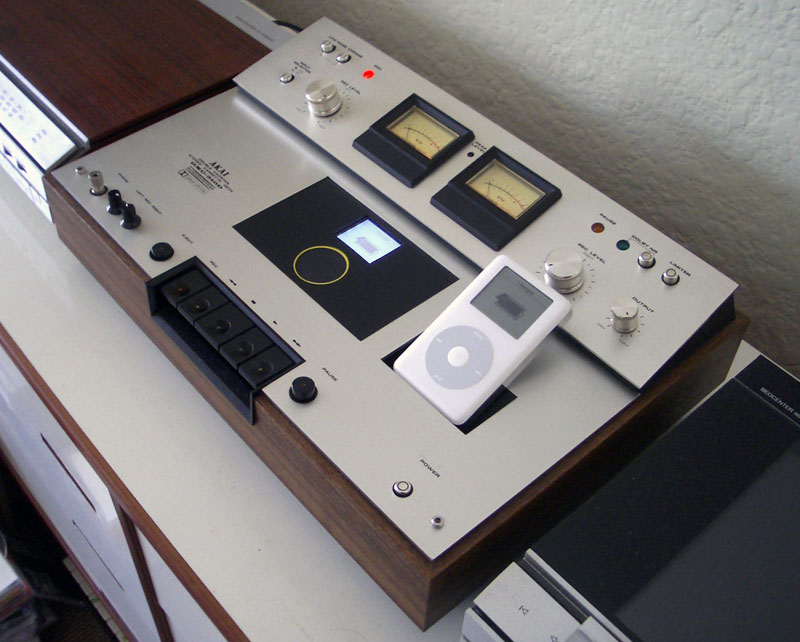 The iPod Mash involves a clash of eras, combining a 4th generation iPod, 3.5″ hard drive, mixing circuitry and the case of an early 80’s AKAI tape player, the unit operates as an audio mixing deck. Tape transport controls are modified to operate an internally mounted iPod, level meters show internal and aux/dock inputs, and volume knobs are used to adjust the audio mix. This project builds on open source resources, adapting freely available circuit schematics and utilises discarded electronic components. The iPod used in constructing the unit was obtained from the iPod Social Outreach Program; the finished object was returned the iPod’s original owner.