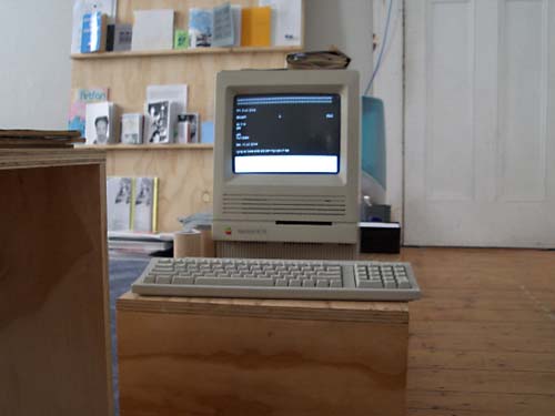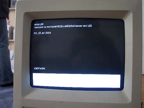 Along with providing internet browsing for the CLUBS project multipleMISCELLANEOUSalliances, I was asked by KNOTWORK (a collaboration between Mick Douglas and Katie Bowman) to set up a program that would allow them (and other artist and visitors to CLUBS) to add text to a continuos, scrolling list. Basically a text log. I decided to use an old Macintosh SE30 I’d picked up in the local hard rubbish (the machine is kind of log shaped).