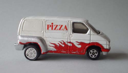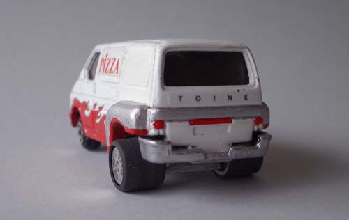 I fixed the front axle, jacked up the car, added fats and wheel arches to the back, painted flames down the side, and tinted the windows.