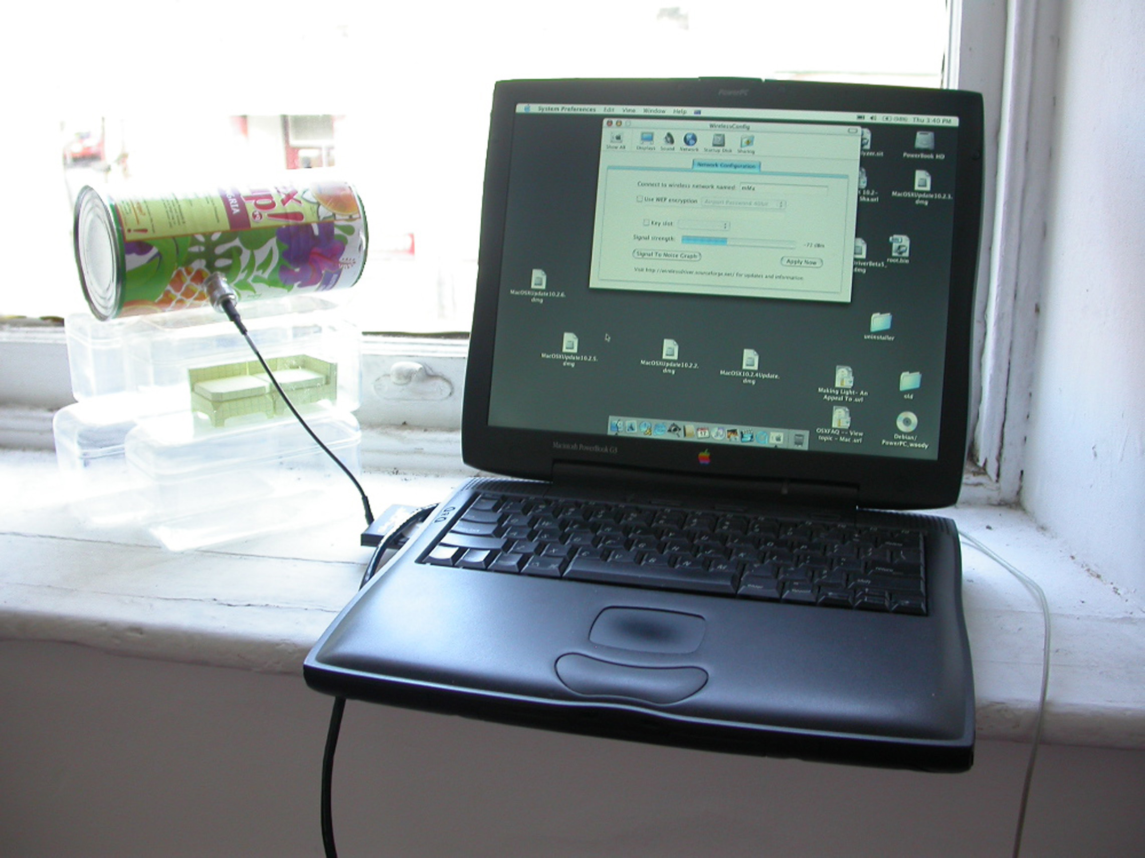 Developed to provide internet access to artist run space CLUBSproject Inc. the wireless internet connection piggybacked of the nearby Gertrude Contemporary Art Space network. A long range wireless link was established through the use of a ‘cantenna’, a directional antenna constructed from a pineapple juice can, and a parabolic reflector, constructed from cardboard and aluminium foil.