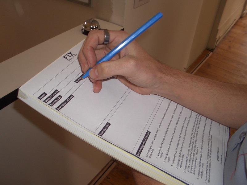 FIX consisted of a repair counter installed at CLUBSproject Inc. manned by a team of enthusiastic volunteers (Carly Fischer, Jophes Fleming, Starlie Giekie, Susan Jacobs, Marcus Keating and myself). The FIX team accepted objects for repair from exhibition visitors. Objects ‘fixed’ included an IKEA foot stool, a MatchBox car, and a desk lamp.