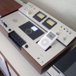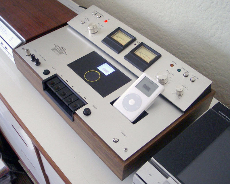 iPod Mash involves a clash of eras, combining a 4th generation iPod, 3.5” hard drive, mixing circuitry and the case of an early ‘80s AKAI tape player, the unit operates as an audio mixing deck. The iPod Mash was awarded third prize in The 2007 Great Mac Mod Challenge.